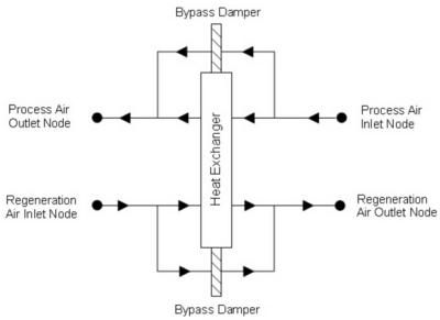 The Desiccant heat exchanger is an HVAC component that models temperature (sensible) and moisture (latent) heat exchange between two airstreams. This air–to-air heat exchanger preconditions the air entering the cooling coil by removing moisture from the air through its desiccant material. The air flow rates as well as the velocities are considered balanced (same for both regeneration and process air streams).