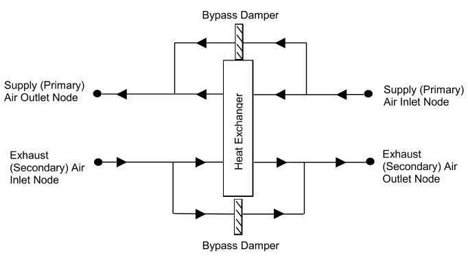 Exhaust Air Recirculation: dampers are used to direct exhaust air back into the zone through the supply side of the heat exchanger when the supply (outdoor) air inlet temperature falls below a threshold temperature (defined in the next input field). The fraction of time that exhaust air is circulated through the supply side of the heat exchanger depends on the supply (outdoor) air inlet temperature with respect to the threshold temperature, the initial defrost time fraction, and the rate of change of defrost time fraction. When exhaust air is being recirculated, no supply (outdoor ventilation) air is being provided through the heat exchanger unit.