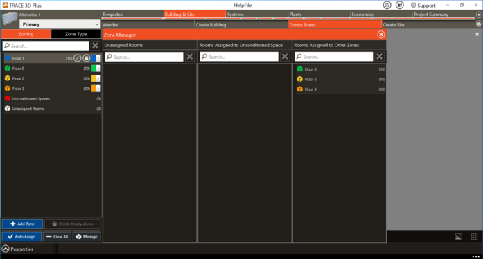 In order to size the components of the system (coils, fans, etc.), the program needs to know what rooms are served by each system. Rooms were already zoned together in the building section of the program. Now those zones are assigned to systems. The Assign Zones screen is comprised of two windows. The tree structure and zone assignments pane, and the system diagram. Zones can be assigned to systems by opening the zone manager, highlighting a system in the tree, and clicking the plus sign next to rooms in the assignment manager that should be assigned to that system. Additionally, zones can be assigned by highlighting a system in the tree and clicking the plus button on the rooms in the system diagram.