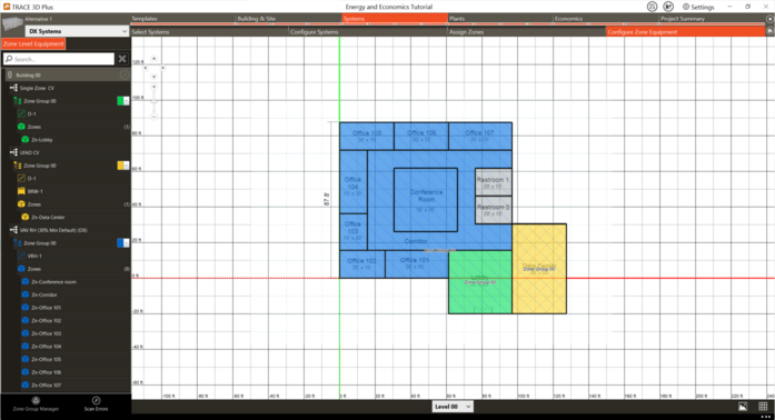 The Zone Equipment section allows for the system to be customized. In this section different pieces of zone level equipment can be added to zones to more properly mimic the actual system.  Zone equipment can be changed for an entire zone group at once to make changes more efficient. Replacing, adding, or removing zone equipment from an individual zone will remove it from its current zone group.