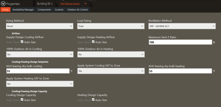 The parameters for the main air handler can be found in Configure Systems -> Properties -> Sizing tab. This scenario is a "typical" VAV reheat system. The leaving cooling design temperature is 55°F and is set to YES to be applied to the zone for sizing: this means that the main air handler will overrule the cooling design temperature in Configure Zone equipment for sizing airflow. The airflows for the zones will be determined based on their cooling sensible loads and the leaving 55°F supply air. In this example, the design leaving cooling supply temperature from the VAV boxes is 55°F, which appeared previously in the Cooling Coils table. The leaving heating design temperature was set equal to the cooling design temperature is set to NO to be applied to the zone for sizing. The terminal VAV box has a heating coil, and the terminal heating coil leaving temperature will be used to size the heating airflow. The main air handler in heating mode is simply acting as a pretreatment device to not send frigid air down the ducts. The main air handler's heating coil will be sized to heat all air requested to 55°F, but the main air handler, itself, will not govern the heating design airflow.
