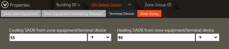 The parameters for the terminal conditioning device can be found in Configure Zone Equipment -> Properties-> Zone Sizing tab. The cooling design supply dry bulb was set equal to the main air handler design cooling dry bulb to remove confusion. Because the main air handler was set to NO for applying the heating design supply dry bulb to the zones, the airflows to the zones are determined based on the Zone Sizing input. In this example, the design leaving heating supply temperature from the VAV boxes is 95°F, which appeared previously in the Heating Coils table.