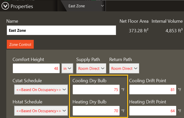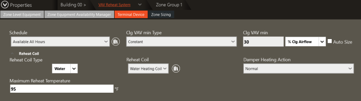 Min Stop / Reheat: This is calculated based on the input in the terminal box properties. The terminal box properties can be found for the zone in the Configure Zone Equipment tab of Systems.