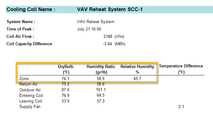 Supply: This is the main supply temperature entered in the system sizing properties. Keep in mind that this is the system level supply air temperature which is not necessarily the supply air temperature to the space. For example, the VAV RH (30% Min Default) (DX) system has a main heating and cooling coil as well as a zone level terminal box reheat coil. The system is designed so the main heating coil preheats the air to 55 F and the reheat coil heats it the rest of the way to 90 F. Because the reheat coil is zone level, it is not considered in this report so the main heating supply temperature is reported as 55 F because this is the leaving preheat coil temperature.