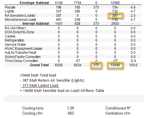 Instant Sensible + Time Delay Sensible - RA Sensible (Lights) = design sensible load for airflow