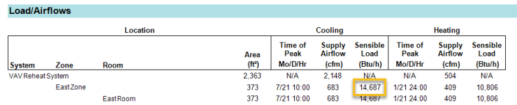 A breakdown of loads for rooms and zones can be found on the Room/Zone Heating/Cooling by Component reports. The Grand Total at the bottom of the table is the total load the room/zone contributes to the building minus ventilation. The room will not feel the RA Sensible (Lights) which is subtracted in the Load/Airflows table in the System Component Summary report. Likewise, the room does not feel the ventilation load, which is not even listed. In this example, the total sensible load of the East Zone to determine the cooling airflow is 6,550 + 8,524 - 387 = 14,687 btuh, equal to the cooling sensible load for the East Zone listed on the Load/Airflows table of the System Component Summary report. Latent load treatment is incidental to the supply air dew point.