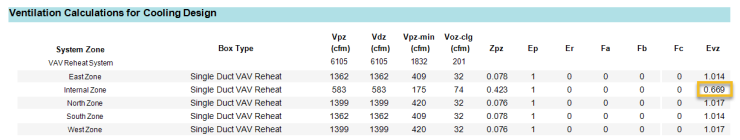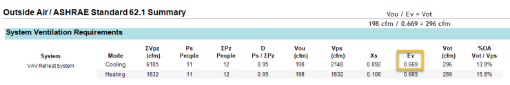 A breakdown of the outside air analysis can be found on the Outside Air / ASHRAE Standard 62.1 Summary report. The system ventilation rate is calculated as either the sum of room ventilation rates or the ASHRAE 62.1 multi-zone method. The parameters for the ASHRAE 62.1 calculation are displayed. The delivered ventilation to each zone is displayed on the Zone Heating/Cooling Loads by Component reports. This rate differs from the requested ventilation rates in the Room Heating/Cooling Loads by Component reports because the main air handler is only able to deliver one mixture to all zones: it cannot deliver 20 % outdoor air to one zone and then 90 % outdoor air to another zone. In the example below, the Internal Zone has the lowest Evz value of 0.669. Thus, the overall outdoor air was inflated according to 198 cfm / 0.669 = 296 cfm, resulting in 13.8 % outdoor air. See ASHRAE 62.1 for more detail on this calculation.