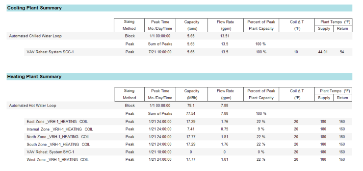 The Cooling and Heating Plant Summary tables appear on the Plant Summary report. Plants that are set to "Peak" sizing will simply add up all peak coil loads from the Ideal Loads Peak calculation. Plants that are set to "Block" sizing will perform an additional calculation to determine the flow required to meet the block load of all the coils in the Simulation Peak calculation (See Ideal Peak Versus Simulation Peak, and the various peak times.) Coil approach matters in the block sizing for calculating the required flow rate through the coils to push the heat through the coil.