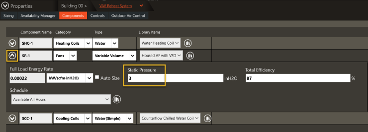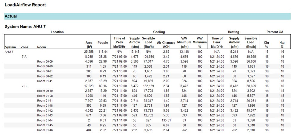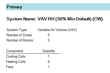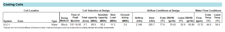The System Component Summary report is the main load design report for populating specifications and equipment schedules. This report provides the heating/cooling rate, airflow, air conditions and water conditions of each coil. The system airflows are calculated based on the heating and cooling airflows required by the rooms and zones, plus any system level overrides applied. System rules are then applied to decide how the heating and cooling airflows should relate. For example, in a constant volume system, the cooling airflow and heating airflow must be the same, so both are set equal to the higher airflow, causing oversizing on either heating or cooling.