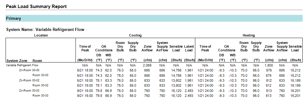 The Peak Load Summary report lists the time of peak, OA Conditions, Room/Zone Drybulb, Supply Airflow Drybulb, Sensible and Latent Load for both Cooling and Heating peak for all rooms and zones.