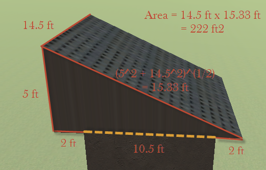 Roof – This is calculated from the centerline of each wall. For example, if the interior space of a room is 10 ft x 10 ft and the wall thickness is 0.5 ft, the roof area is calculated as 10.5 ft x 10.5 ft = 110.25 ft2. For a flat roof with an overhang, the overhang is not included in the roof area. For a sloped roof, the roof area is calculated as the the sloped surfaces of the roof. For a sloped roof with an overhang, the entire sloped roof is included in the roof area. For example, if the interior space of a room is 10 ft x 10 ft and the wall thickness is 0.5 ft, the room has a shed roof with a peak height of 5 ft and an overhang of 2 ft, the roof area is calculated as follows.