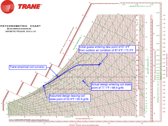 Version 4.13.207 and later can automatically solve the psychrometric loop (if the loop is possible to be closed). Version 4.12.74 and earlier could not. In all versions, the default process is to have the user assume the design supply air temperatures. When this path is used, the leaving cooling coil state point is calculated using the same TRACE 700 coil curves, except that the initial guess for the entering dew point is set equal to the highest enthalpy outdoor air dew point. The design leaving coil state point is based on the Trane coil curves using this initial guess entering dew point. The design entering coil state point applies the actual loads, outdoor air mixture, and zone state points.