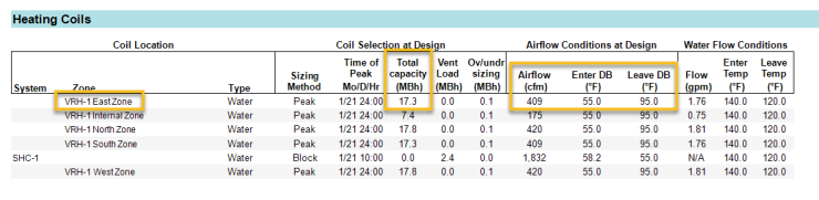 The Heating Coils section lists all heating coils. In the example below, the terminal heating coil for the East Zone is 17.3 MBh (17,300 btuh). The airflow rate is 409 cfm. The entering air to the VAV box is 55°F from the main air handler. The design leaving temperature from the VAV box in heating mode is 95°F. Because nothing about the system forced an override onto the final heating design airflow, the 409 cfm in the Heating Coils table matches the 409 cfm heating airflow for the East Zone in the Load/Airflows table.