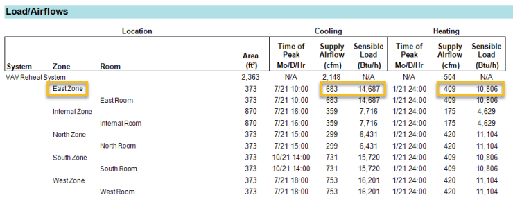 10,806 btuh in the Load/Airfows table is lower than the East Zone VAV box capacity in the Heating Coils table above because the VAV box is also require to raise the supply air from 55°F. Notice that the Load/Airflows load is based on the East Zone heating dry bulb of 70°F and not the entering supply air dry bulb of 55°F. The Load/Airflows table shows the user how to size the maximum and minimum airflows for each VAV box, assuming no other overrides or restrictions have been applied. For the East Zone VAV box, the design airflow with the damper fully open is 683 cfm, and the minimum stop position is 409 cfm (60 %). Because 60 % may seem high to some users or regulators, it may be recommended the increase the design heating supply dry bulb to the zone in Configure Systems or Configure Zone Equipment, whichever is governing the zone heating supply dry bulb.